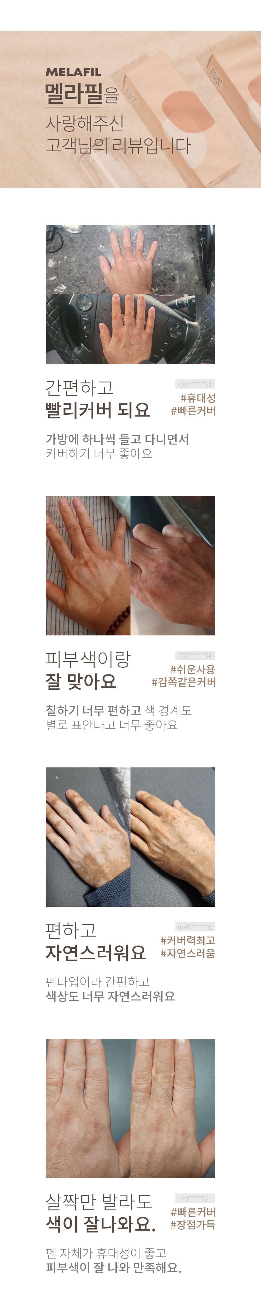 사용방법 1. 사용 전에 커버가 필요한 피부에 유/수분을 제거한다.2. 펜커버로 균일하게 채워준다.3. 제품 사용 후 6시간 이내에 유/수분이 닿지 않도록 유의한다.4. 2~3일 이내로 리터치 시 커버효과가 더 오래지속 된다.5. 사용 후 캡을 꼭 닫아서 보관한다.